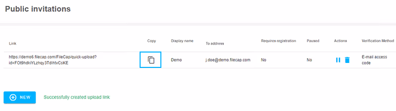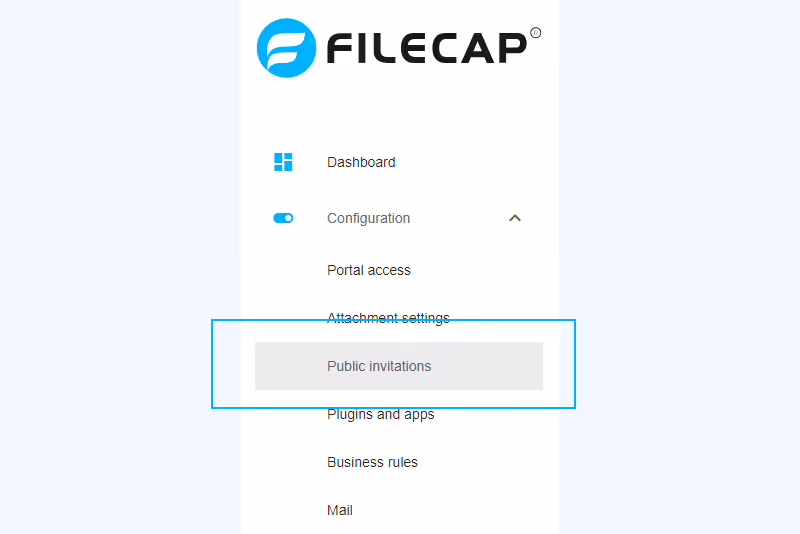 Voor eenmalig gebruik of projecten waarbij je voor een bepaalde periode externen jou berichten wil laten toezenden, kun je een publieke uitnodigingslink maken. Dit doe je vanuit de beheerconsole van FileCap: ga vanuit de beginpagina naar Configuration en klik daar op Public Invitations. Klik op New om voor een e-mailadres een via internet toegankelijke link te maken waarmee naar dat e-mailadres via FileCap gemaild kan worden.