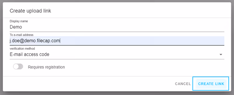 Bij Display Name vul je nu de naam in van de ontvanger (jouw naam) en onder To e-mail adress jouw e-mailadres. Vervolgens kun je nog de verificatiemethode kiezen die de verzender moet toepassen (Wil je geen verificatie? Kies dan None). Wil je meer zekerheid over met wie je aan het mailen bent, zet dan ook de optie Requires registration aan. Klik tot slot op Create Link.