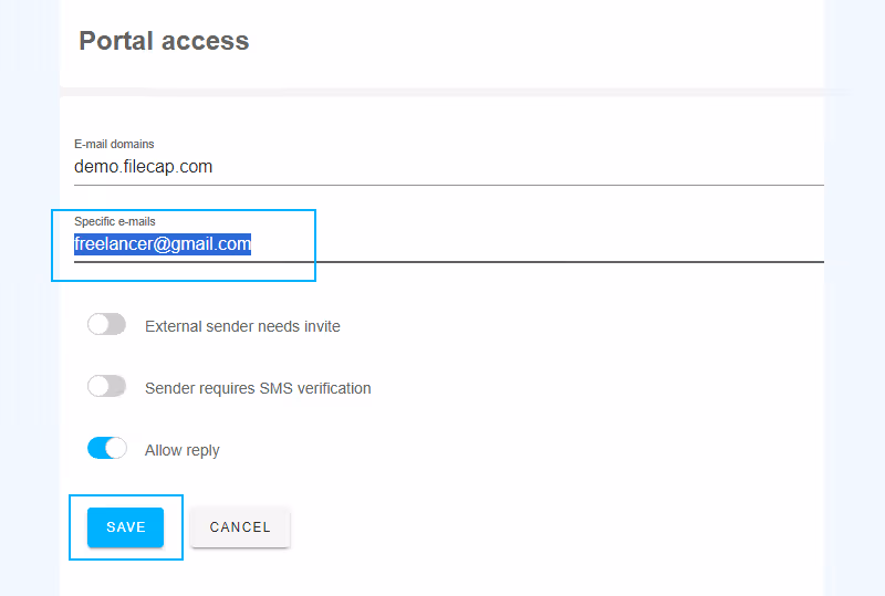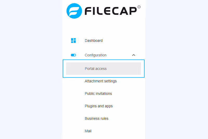 Werk je met vaste freelancers of nul-uren contractanten zonder e-mailadres van je organisatie, dan kun je ze bij voldoende FileCap-licentieruimte toevoegen aan je FileCap-bestand. Door dit via onderstaande stappen te doen, verkrijgen ze dezelfde mogelijkheden als reguliere FileCap-gebruikers in je organisatie en kunnen ook zij onbeperkt veilig e-mailen en grote bestanden delen. Je voegt additionele gebruikers toe via de beheerconsole, waarin je naar de optie Configuration gaat, waaronder je de optie Portal Access aanklikt. Onder het e-maildomein van je portal (zie punt 2), vind je een veld om e-mailadressen in te vullen die niet tot de eigen directory behoren, bijvoorbeeld adressen eindigend op @gmail.com, @protonmail.com of @outlook.com.