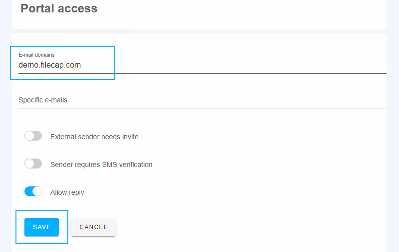 Wil je niet dat externen jou via jouw FileCap-portal e-mail & bestanden gaan sturen? Zet dan de optie ‘External sender needs invite’ aan, waarmee je mensen van buiten je organisatie alleen toestaat met jou te mailen via een publieke uitnodigingslink (zie punt 1).