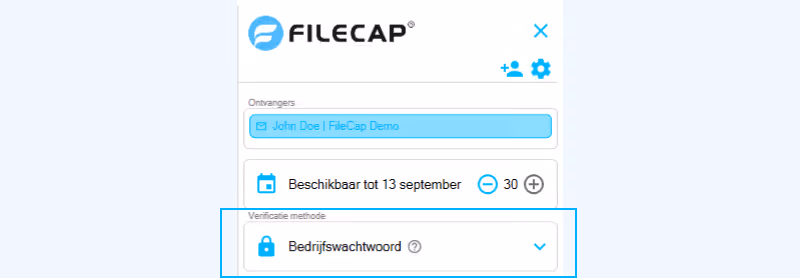 Je gebruikt het bedrijfswachtwoord door bij het opstellen van een mail in de FileCap plugin onder de gekozen verificatiemethode Bedrijfswachtwoord te kiezen.