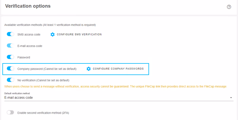 Heb je het wachtwoord ingesteld, dan kun je nog aangeven of dit de standaard verificatiemethode voor gebruikers moet worden. Dit kan interessant zijn als FileCap enkel of vooral voor interne mail wordt gebruikt! Eventueel kun je ook het bedrijfswachtwoord combineren met een tweede verificatiemethode en op die manier veiliger van deze functionaliteit gebruikmaken en het securityniveau van je organisatie verhogen.