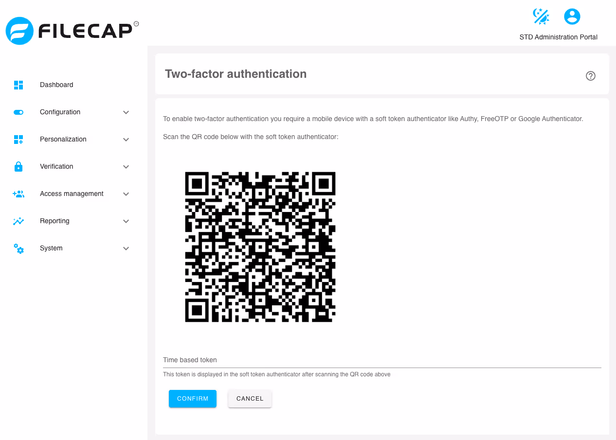 Scannen Sie den QR-Code mit einer Authentifizierungs-App, wie z.B. Authy, FreeOTP oder Google Authenticator, und geben Sie den aktuell erhaltenen Token unter "Time-based token" ein.