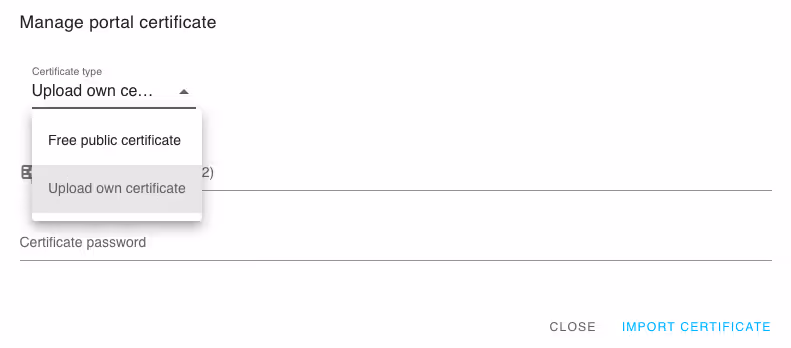 Wenn diese Option ausgewählt ist, können Sie Ihr eigenes Zertifikat für dieses spezielle Portal hochladen.