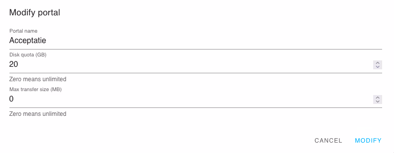 Ändern Sie das "Festplattenkontingent" dieses Portals in Gigabyte. Wenn dieser Wert auf 0 gesetzt ist, gibt es keine Begrenzung.