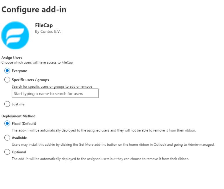 There are two options for installing the FileCap Office 365 add-in, per user or for the entire organization, both of which are explained below.